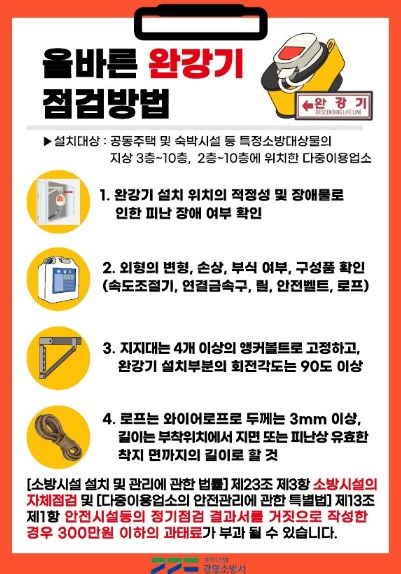 주요 내용으로는 ▲숙박시설 대상 완강기 자체점검 체크리스트 운영 ▲관계인 대상 관리·점검 교육 ▲시민 대상 체험형 완강기 사용교육 ▲완강기 위치 안내표지 설치 홍보 ▲온라인·SNS 카드뉴스 홍보 등이 포함된다.