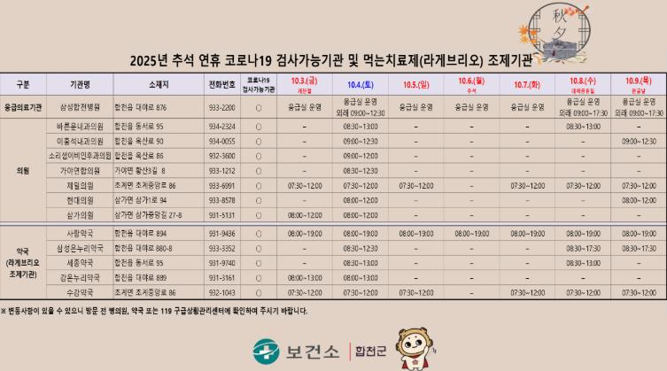 특히 코로나19 먹는치료제 ‘라게브리오’를 연휴기간 운영하는 조제기관에 조정 비치하여 군민들이 치료제 수급에 불편함이 없도록 지원한다.