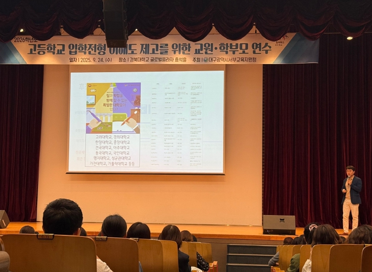 [뉴스노크=김인호 기자] 대구서부교육지원청은 9월 24일 경북대학교 글로벌플라자 효석홀에서 관내 중학교 3학년 학부모와 교원을 대상으로 ‘2026학년도 고등학교 입학전형 이해도 제고를 위한 연수’를 실시했다.