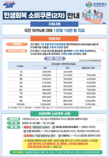 [뉴스노크=김인호 기자] 창원특례시는 추석 명절을 앞두고 민생회복 소비쿠폰 2차 지급을 통해 지역경제에 활력을 불어넣고 소상공인들에게 힘을 보내고 있다. 이번 2차 지급 대상은 총 91만 5,548명으로, 9월 22일부터 지급이 시작된 지 며칠 만에 벌써 84.5%에 해당하는 77만 3,719명이 발급받아 시민들의 높은 관심을 입증했다.