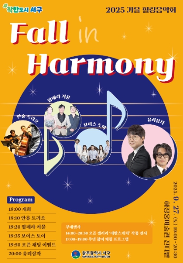 [뉴스노크=김인호 기자] 광주광역시 서구는 오는 27일 오후 7시 농성동 하정웅미술관 앞 잔디광장에서 ‘2025 가을 힐링음악회 – 폴 인 하모니(Fall in Harmony)’를 개최한다.