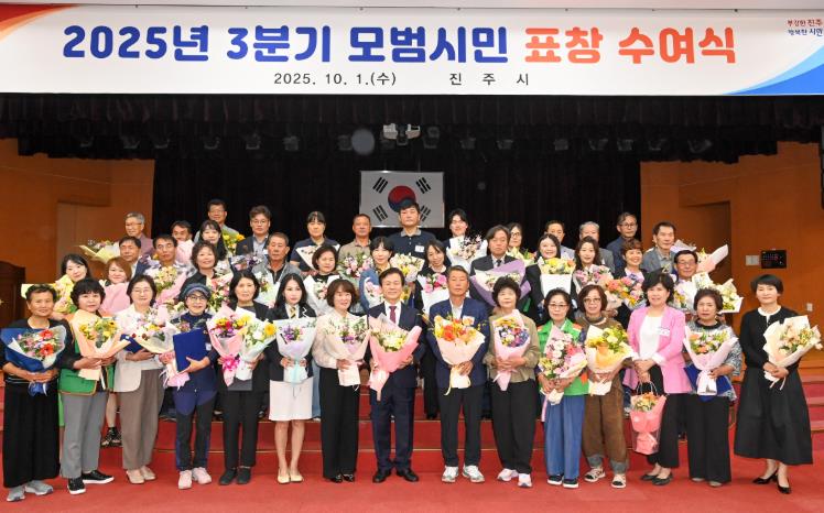 [뉴스노크=김인호 기자] 진주시는 1일 지역사회 발전과 봉사활동을 몸소 실천하며 귀감이 된 모범시민 81명을 대상으로 ‘2025년 3분기 모범시민 표창 수여식’을 개최했다.