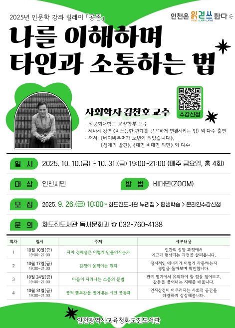[뉴스노크=김인호 기자] 인천광역시교육청화도진도서관은 10월 10일부터 31일까지 매주 금요일 4회에 걸쳐 인문학 강좌 ‘나를 이해하며 타인과 소통하는 법’을 운영한다.