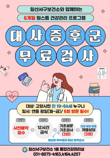 일산서구보건소 1층 통합건강관리실에서는 대사증후군 검진 시 혈액검사(공복혈당, 고지혈증, 간기능, 빈혈 등)와 혈압, 체성분 및 복부둘레를 측정한다. 검사 결과를 바탕으로 간호사․영양사․운동처방사의 개인별 맞춤 상담과 함께 6개월간 체계적인 건강관리 서비스(6회 내소)를 받을 수 있다.