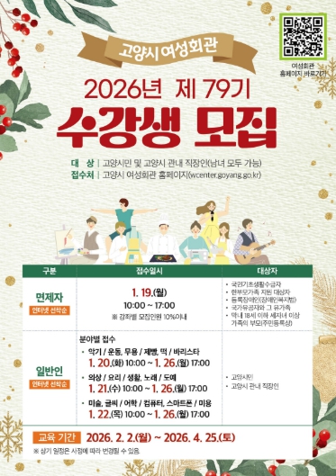 [뉴스노크=김인호 기자] 고양특례시 여성회관은 오는 1월 19일부터 26일까지 2026년도 제79기 정규강좌 수강생을 모집한다고 밝혔다.