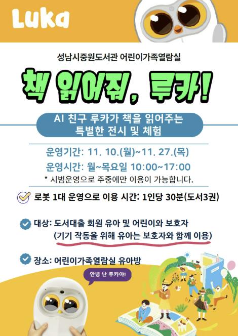 이번 사업은 루카를 활용한 전시와 기관 협력 프로그램을 통해 어린이들에게 친숙하고 흥미로운 독서 경험을 제공하고자 마련됐다.