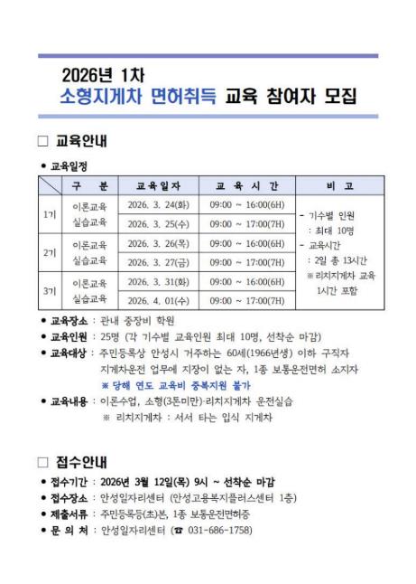 [뉴스노크=김인호 기자] 안성시는 2026년 맞춤형 취업지원 교육의 일환으로 오는 3월 12일부터 ‘1차 소형지게차 면허취득 교육’에 참여할 교육생을 모집한다.
