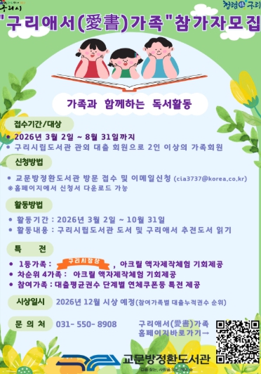 백경현 구리시장은 “'구리애서(愛書)가족'은 가족이 함께 책을 읽으며 소통하고, 독서가 일상이 되는 문화를 만들어가는 의미 있는 프로그램”이라며 “도서관과 함께 이어가는 꾸준한 독서 경험이 가족 모두에게 성장의 시간이 되길 기대한다”라고 말했다.