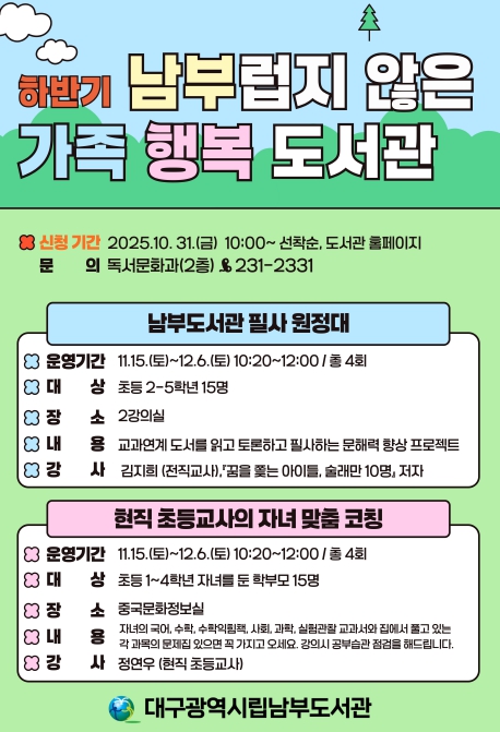 [뉴스노크=김인호 기자] 대구남부도서관은 11월 15일부터 12월 6일까지 매주 토요일, 부모와 자녀가 함께 도서관을 찾아 각자 맞춤형 독서·학습 프로그램에 참여하는 ‘남부럽지 않은 가족 행복 도서관’을 운영한다.