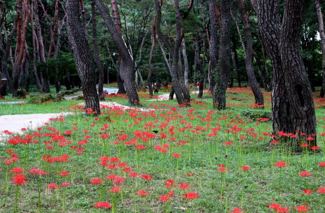 숲 왼쪽에는 사철 푸른 맥문동, 오른쪽에는 가을이면 붉게 피어나는 꽃무릇이 식재돼 현재 절정을 이루고 있다. 소나무 사이로 붉은 꽃길을 따라 걷는 산책로가 조성돼 가을의 정취를 만끽할 수 있으며, 인근 웅양면 활력충전소 북카페에서는 지역 특산 음료도 즐길 수 있다.