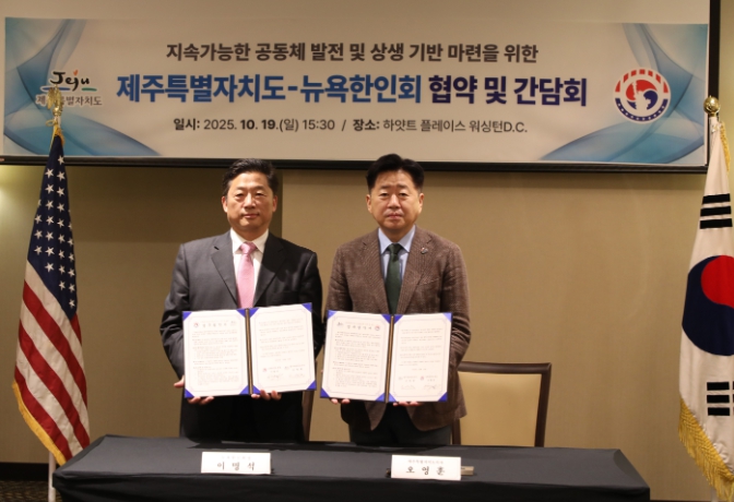 오영훈 지사는 “뉴욕한인회와의 업무협약은 한인사회 발전과 고국 연결을 강화하는 계기”라며 “제주의 미래와 미주 한인사회의 번영이 서로에게 힘이 되고, 한미 양국 관계 발전에도 기여할 것”이라고 강조했다.