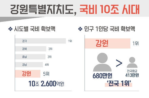 [뉴스노크=김인호 기자] 강원특별자치도는 국비 확보 10조 시대에 진입한 가운데, 인구 1인당 국비 확보액이 약 680만 원으로 전국 1위에 해당한다고 밝혔다.