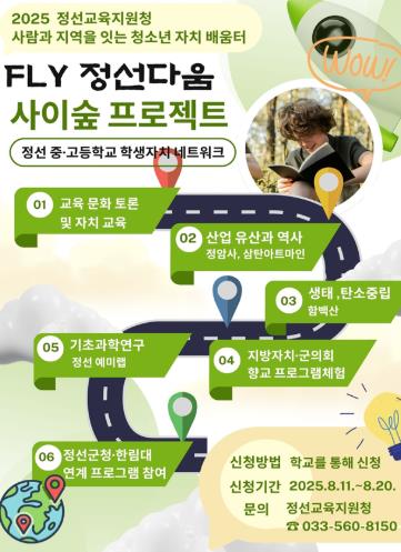 [뉴스노크=김인호 기자] 정선교육지원청은 8월부터 11월까지 정선군과 함께 관내 청소년들의 자치 역량 강화와 지역 정체성 함양을 위한 ‘플라이(FLY) 정선다움, 사이숲 프로젝트’를 운영한다고 27일 밝혔다.