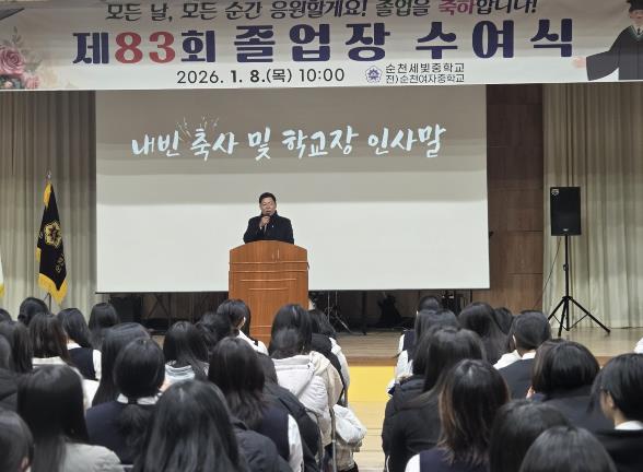 [뉴스노크=김인호 기자] 김정희 전남도의회 교육위원장은 1월 8일, 순천세빛중학교에서 열린 제83회 졸업식에 참석해 졸업생들의 새로운 출발을 축하하고, 전남교육의 미래를 향한 따뜻한 격려의 메시지를 전했다.