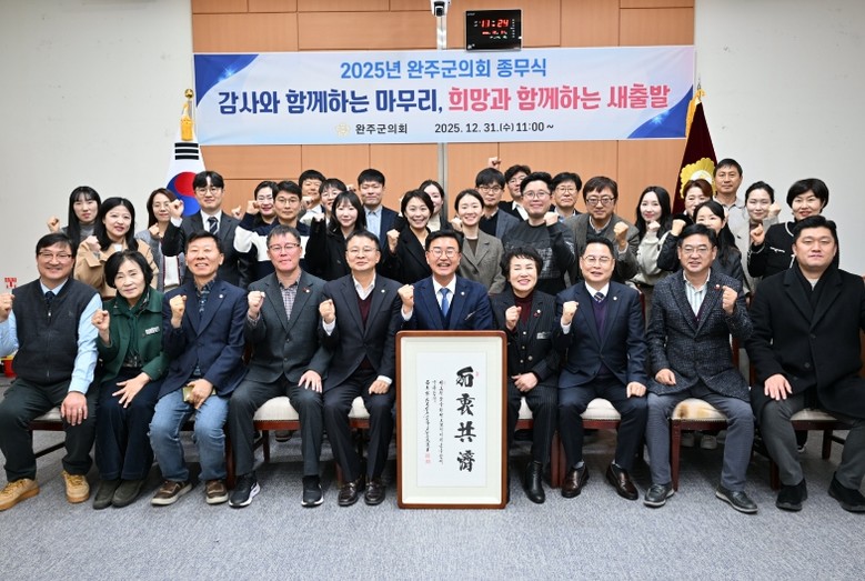 [뉴스노크=김인호 기자] 완주군의회는 31일 문화강좌실에서 11명 군의원 전원과 의회사무국 직원 등 40여 명이 참석한 가운데 2025년도 종무식을 개최했다.