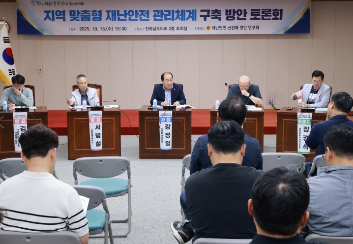 [뉴스노크=김인호 기자] 전라남도의회 의원 연구단체인'재난안전 선진화 방안 연구회'는 지난 10월 15일 전라남도의회 초의실에서 강정일 대표의원(광양2) 주재로 ‘지역 맞춤형 재난안전 관리체계 구축 방안’에 대한 토론회를 개최했다.