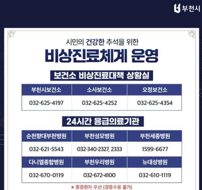 응급환자와 진료가 필요한 시민을 위해 응급의료기관은 24시간 운영하고, 병·의원과 약국은 참여 희망일에 문을 열어 시민들이 필요할 때 의료서비스를 이용할 수 있도록 지원해 의료서비스 공백을 최소화할 계획이다. 부천시는 이와 함께 연휴 기간 중 발생할 수 있는 각종 상황에 신속히 대응하기 위해 보건소 내에 ‘비상진료상황실’을 설치해 운영한다.