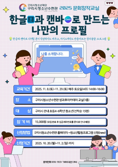 [뉴스노크=김인호 기자] 구리시청소년재단 청소년수련관은 청소년들의 디지털 문해력 향상과 자기 표현력 강화를 위한 실습형 프로그램 '한글과 캔바로 만드는 나만의 프로필'의 참가자를 10월 20일부터 11월 2일까지 수련관 홈페이지에서 선착순 모집한다고 밝혔다.