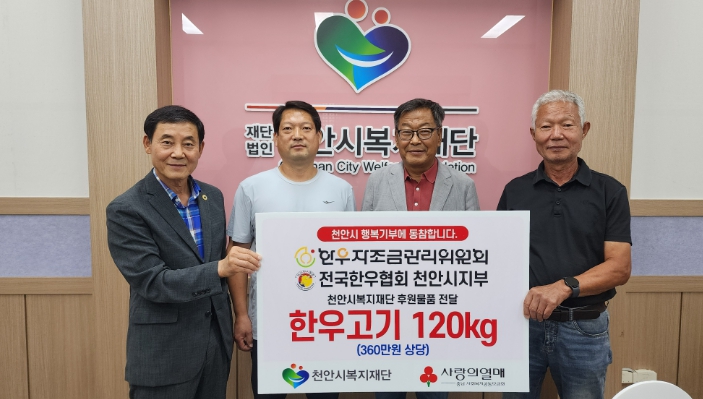 [뉴스노크=김인호 기자] (재)천안시복지재단은 22일 한우자조금관리위원회와 전국한우협회 천안시지부가 360만 원 상당의 한우 국거리 120kg를 기탁했다고 밝혔다.