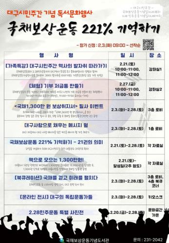 특히 ‘21일’을 기억하는 의미를 담아 대구시민주간 동안 도서 대출 권수를 21권으로 확대하는 ▲국채보상운동 221% 기억하기 – 21권의 의미 행사를 진행하고, 국채보상 시민 북챌린지로 ▲책으로 모으는 1,300만 원! 이벤트를 통해 13,000권 도서 대출을 달성한 후, 1,300권 단위로 해당 대출자에게 상품권을 증정한다.