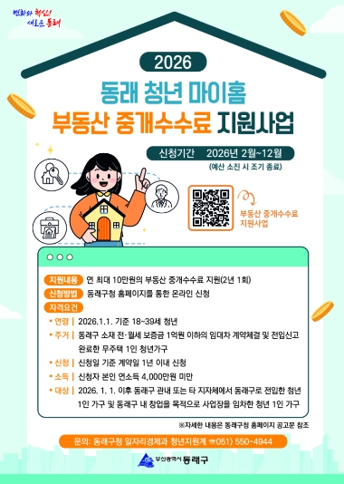 [뉴스노크=김인호 기자] 부산 동래구는 청년의 주거 안정을 지원하고 청년 창업을 유도하기 위해 ‘2026년 동래 청년 마이홈 부동산 중개수수료 지원 사업’을 추진한다고 밝혔다. 접수 기간은 12월 10일까지이며, 예산 소진 시 조기 마감된다.