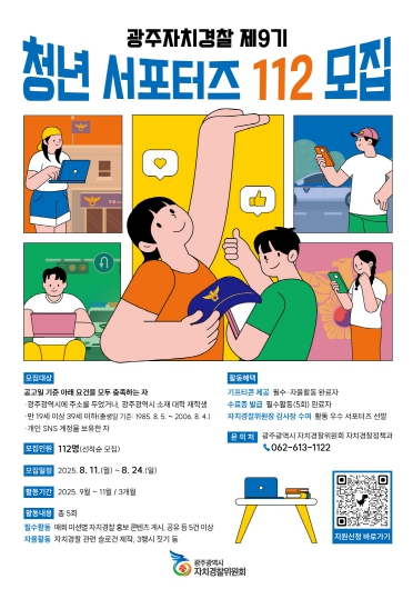 [뉴스노크=김인호 기자] 광주광역시자치경찰위원회는 오는 11일부터 24일까지 ‘제9기 청년 서포터즈 112’ 112명을 모집한다.