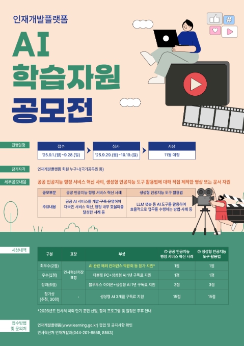 인사혁신처는 공무원의 인공지능 활용 역량을 높이고, 공직 내 학습 문화를 확산하기 위해 ‘인재개발플랫폼 인공지능 학습자원 공모전’을 개최한다고 1일 밝혔다.