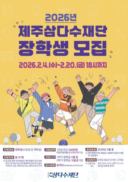 [뉴스노크=김인호 기자] 재단법인 제주삼다수재단(이사장 백경훈)이 제주와 대한민국의 미래를 이끌어갈 우수 인재 양성을 위해 2026년도 제주삼다수 장학생을 모집한다.