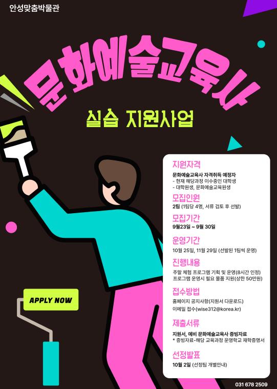 [뉴스노크=김인호 기자] 안성시 안성맞춤박물관은'2025년 문화예술교육사 실습 지원사업'추진을 위해 오는 9월 23일부터 9월 31일까지 실습생을 모집한다.