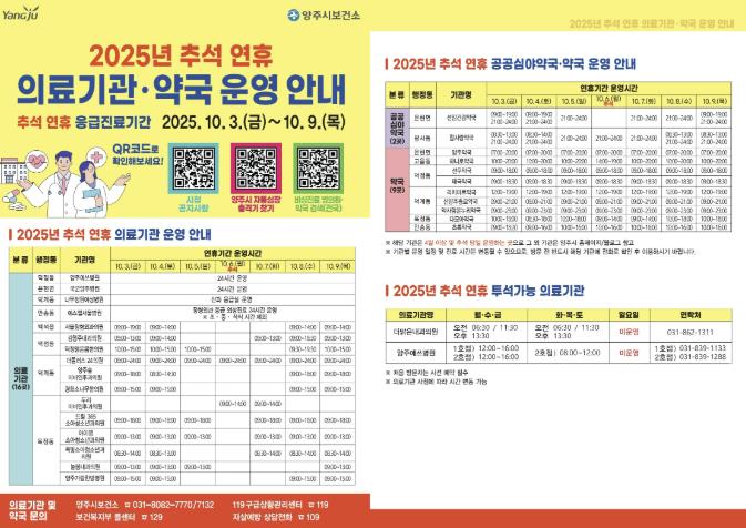 시는 연휴 기간 동안 의료 공백을 줄이기 위해 24시간 진료가 가능한 당직의료기관인 양주예쓰병원을 비롯해, 일자별로 지정된 병의원과 약국을 운영한다.