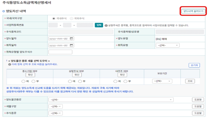 ▲ 홈택스 미리채움 서비스(양도내역 불러오기) |