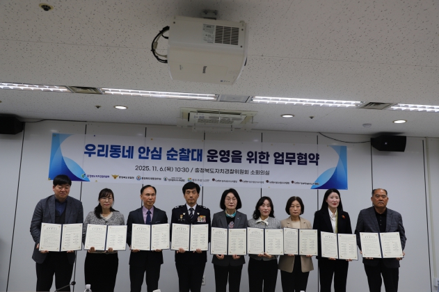 [뉴스노크=김인호 기자] 충북자치경찰위원회는 지난 6일, 충청북도경찰청, 충청북도재향경우회, 청주권 6개 시니어클럽과‘우리동네 안심 순찰대’운영을 위한 업무협약을 체결했다.