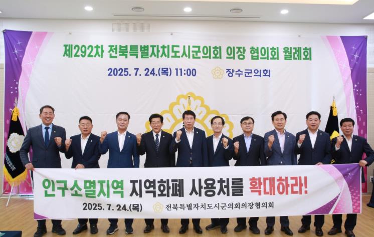 [뉴스노크=김인호 기자] 장수군의회는 24일, 제292차 전북특별자치도시군의회의장협의회 월례회에 제출한 ‘인구소멸지역화폐 사용처 확대 촉구 건의안’과 ‘미국산 사과 수입 반대 결의안’이 채택됐다고 밝혔다.