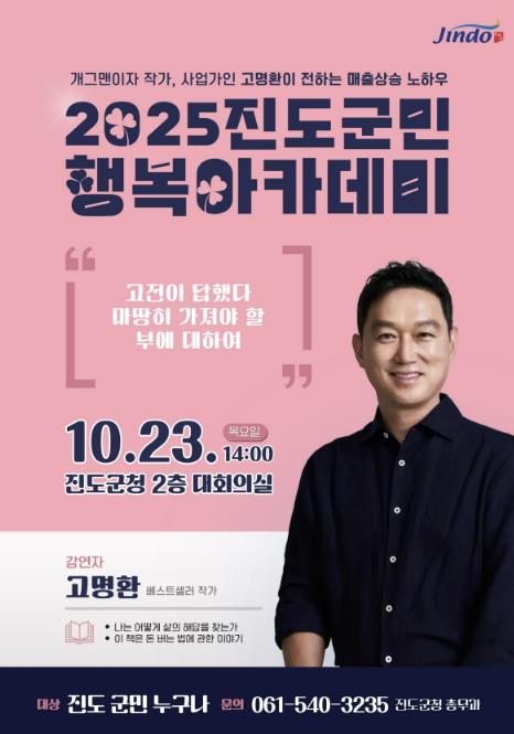 김희수 진도군수는 “이번 진도 군민행복 아카데미는 군민들이 유쾌한 웃음과 함께 삶의 방향을 되돌아보는 시간이 되길 기대하며 준비한 강연이다”라며, “고명환 작가와 함께 삶의 지혜와 감동을 나누는 소중한 시간이 되시길 바란다”라고 말했다.