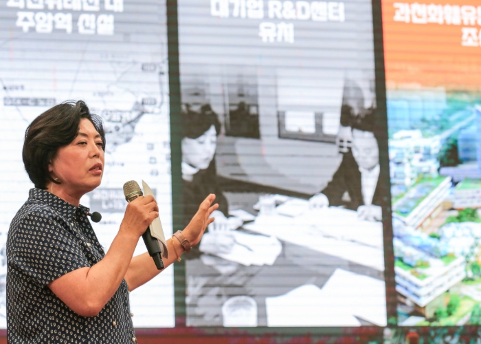 ▲ 2024년 7월 열린 민선8기 2주년 기념 시정설명회에서 신계용 과천시장이 시정 운영 계획을 설명하고 있다 |