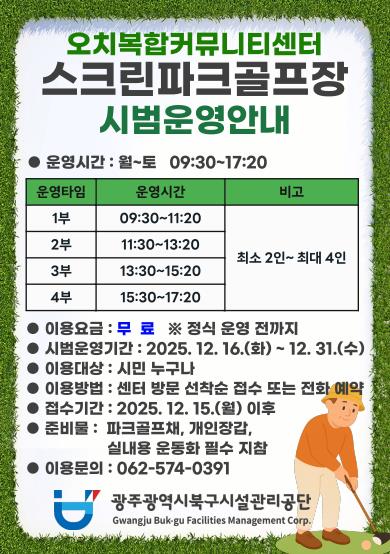 [뉴스노크=김인호 기자] 광주광역시북구시설관리공단은 오치복합커뮤니티센터 4층에 북구 관내 최초의 공공 실내 스크린파크골프장을 조성하고, 오는 16일 시범운영에 들어간다고 밝혔다.