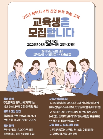 훈련 대상은 평택시에 거주하는 만 15세 이상 39세 이하 미취업 청년이며, 교육 기간은 8월 25일부터 11월 21일까지 약 3개월간 진행된다.