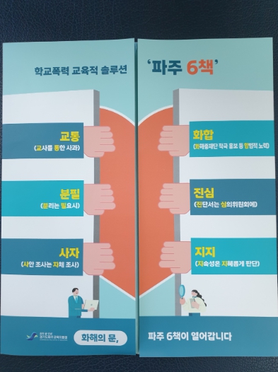 [뉴스노크=김인호 기자] 경기도파주교육지원청은 지난 4월, 학교폭력의 교육적 해결 활성화를 위한 6가지 노하우를 6가지의 쉬운 단어로 표현한 ‘파주 6책’을 수립하여 관내 학교를 대상으로 홍보하고 시행했다.