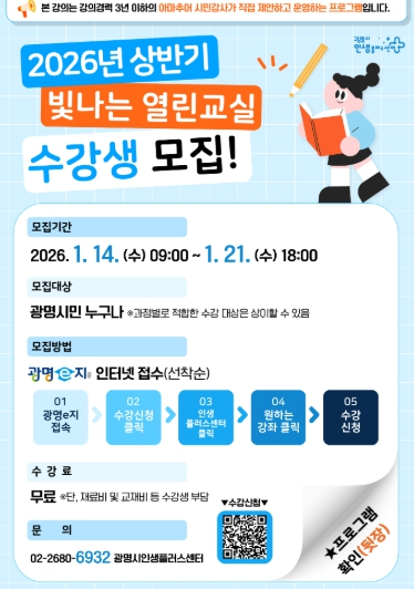 [뉴스노크=김인호 기자] 광명시 인생플러스센터는 오는 14일부터 21일까지 시민이 기획하고 운영하는 ‘2026년 상반기 빛나는 열린교실’의 수강생 230명을 모집한다.