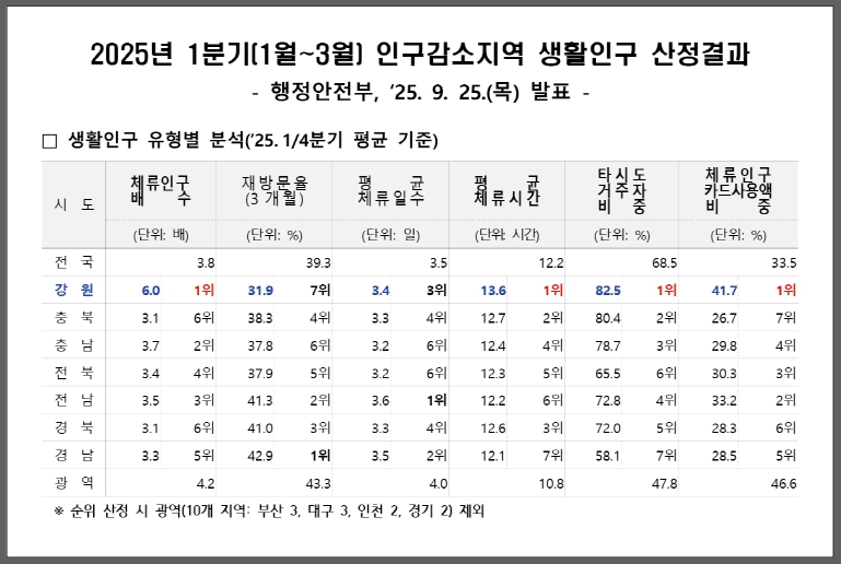 [뉴스노크=김인호 기자] 강원특별자치도는 행정안전부가 9월 25일 발표한 ‘2025년 1분기 인구감소지역 생활인구 산정 결과’에서 체류인구 총 2,826,012명으로 전국 최고 수준을 기록했다고 밝혔다.