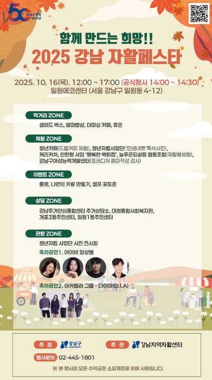 [뉴스노크=김인호 기자] 꿈이 모이는 도시, 미래를 그리는 강남구가 10월 16일 낮 12시부터 오후 5시까지 일원에코센터에서 ‘2025 강남 자활페스타’를 개최한다.