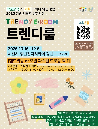 ▲오일파스텔 드로잉 ▲핸드위빙으로 구성하여 예술 작품 제작 및 전시를 준비 및 운영함으로써 문화 기획과 창작 역량을 동시에 강화하는 본 과정은 19세 이상 39세 이하 관내 청년이면 누구나 10월 13일부터 큐알(QR)코드를 통해 신청할 수 있다.