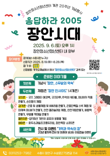[뉴스노크=김인호 기자] 수원시청소년청년재단 장안청소년청년센터는 개관 20주년을 맞아 오는 2025년 9월 6일 오후 1시부터 센터 내‧외부에서 기념행사 ‘응답하라 2005 장안시대’를 개최한다.