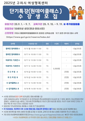[뉴스노크=김인호 기자] 구리시 여성행복센터는 오는 9월 1일부터 7일까지 2025년 ‘원데이클래스’ 수강생을 모집한다.