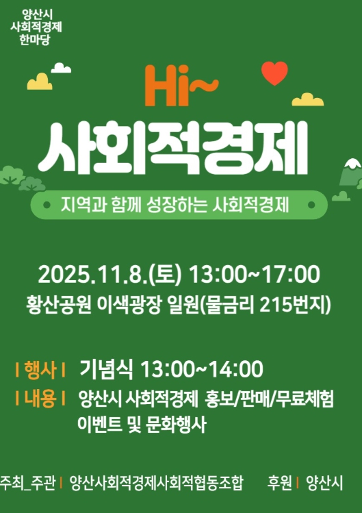 [뉴스노크=김인호 기자] 양산시는 오는 8일 오후 1시부터 오후 5시까지 황산공원 이색광장 일원에서 2025년 사회적경제 한마당(부제‘Hi~ 사회적경제’) 행사를 개최한다.