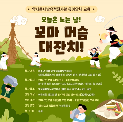 [뉴스노크=김인호 기자] 울산 약사동제방유적전시관이 관내 어린이집과 유치원 원아(5세~7세)를 대상으로 머슴날(음력 2월 1일)과 관련한 교육 프로그램 ‘오늘은 노는 날! 꼬마 머슴 대잔치!’를 운영한다.
