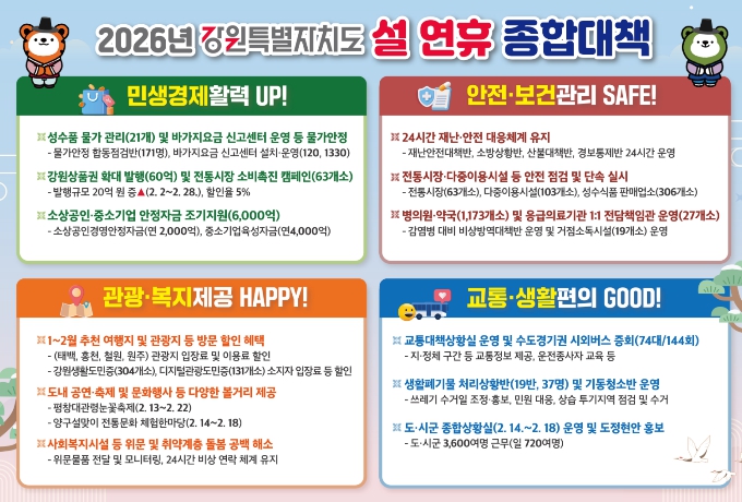 [뉴스노크=김인호 기자] 강원특별자치도는 2월 14일부터 18일까지 5일간 이어지는 설 명절을 맞아 도민과 귀성객, 방문객 모두가 안전하고 즐거운 명절을 보낼 수 있도록 ‘설 연휴 종합대책’을 추진한다.