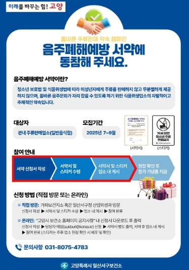 [뉴스노크=김인호 기자] 고양특례시 일산서구보건소는‘올바른 주류판매 약속 캠페인, 음주폐해예방 서약’에 참여할 업소를 모집한다고 밝혔다.
