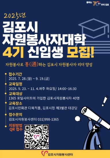 2024년부터 시작된 김포시자원봉사자대학은 교육을 넘어 자원봉사자들이 서로의 경험을 공유하고 연대할 수 있는 소중한 장으로, 참여를 원하는 시민은 김포시자원봉사센터 홈페이지를 참조하거나 전화로 문의하면 된다.