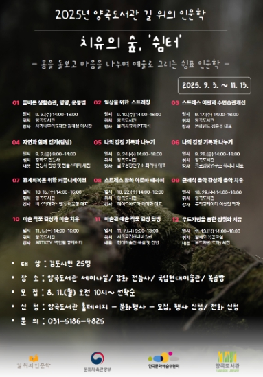 [뉴스노크=김인호 기자] 김포시 양곡도서관이 오는 9월 3일부터 11월 13일까지 통합 치유 인문학 프로그램 '치유의 숲, 쉼표'을 선보인다. 올해 ‘길 위의 인문학’ 공모 선정에 따라 추진되는 이번 과정은 산림치유, 예술활동, 명상을 묶은 체험형 커리큘럼으로, 지역 주민에게 깊이 있는 휴식을 제공할 예정이다.